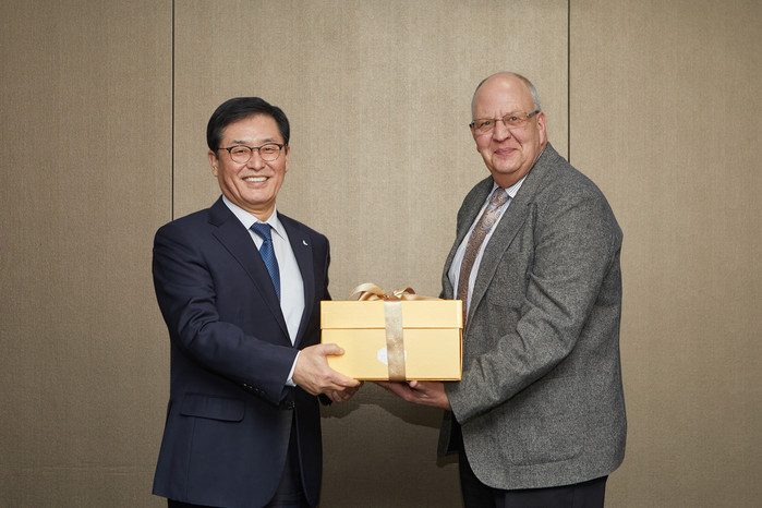 | ▲24일 SPC그룹 양재동 본사에서 열린 'SPC그룹 푸드뱅크 사업 사례 설명회'에서 글로벌 푸드뱅킹 네트워크 크레이그 네미츠 이사(우)와 파리크라상 권인태 대표가 기념촬영을 하고 있다. |