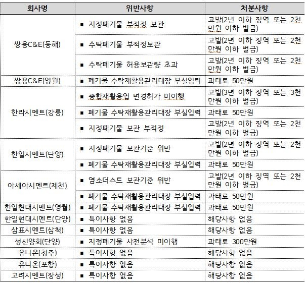 한일현대시멘트가 폐기물 수탁재활용관리대장 부실입력으로 과태료 50만원 처분을, 성신양회(충북 단양)는 지정폐기물 사전분석 미이행으로 과태표 300만원 처분을 받았다.