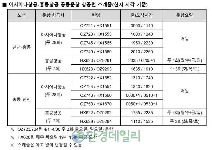 이번 공동운항으로 아시아나항공 승객들은 홍콩항공 운항편을 통해 아시아나항공이 운항하지 않는 심야 혹은 오후 시간대에 홍콩으로 이동할 수 있어 스케줄 선택의 폭이 보다 넓어질 전망이다.