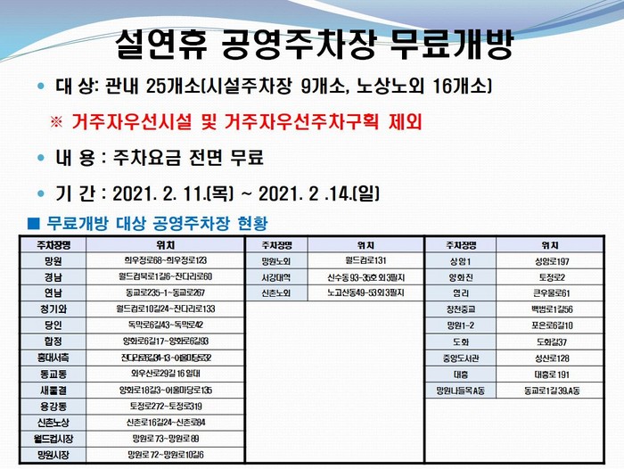 [환경데일리 고용철 기자]서울시 마포구는 올 설을 맞아 연휴기간동안 지역 내 공영 주차장을 무료로 개방한다. 대상 주차장은 시설주차장 9개소와 노상‧노외주차장 16개소 등 총 25개소의 마포구 지역 내 유료 공영주차장으로 거주자우선주차장은 제외된다.