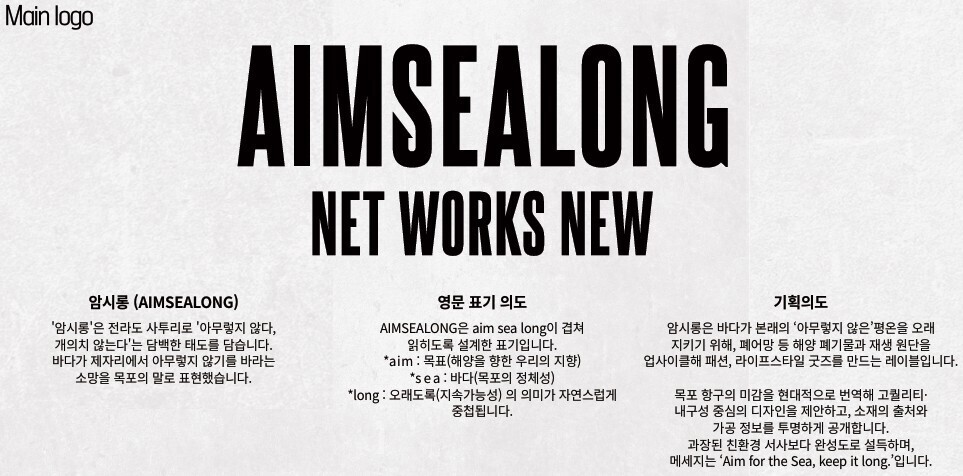 우리의 바다가 본래의 모습을 지켜가며 아무렇지 않기를 바라는 바람을 담아 이름 지어졌다. 여기에 목표(AIM), 바다(SEA), 지속성(LONG)의 의미를 더해 친환경 가치와 지속가능성을 지향하는 업사이클링 브랜드로 기획됐다.