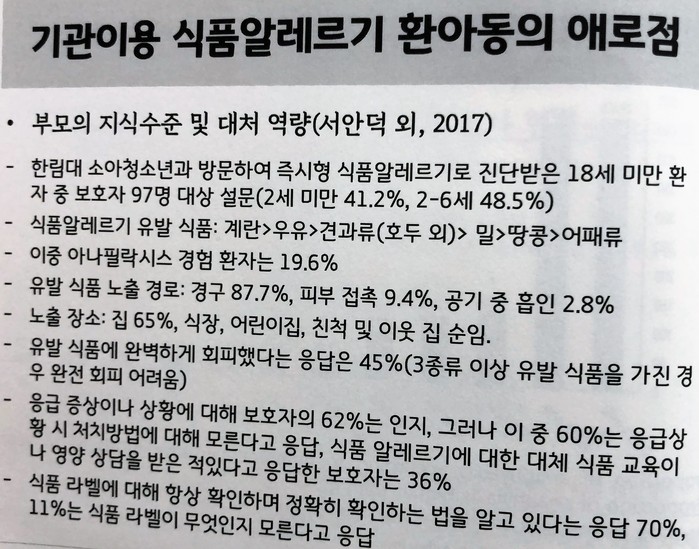 아주의대 아주대병원 이수영 교수는 "국내 소아 식품알레르기의 약 20% 많게는 40%는 집에서 아닌 사회(유치원 등) 속에서 발생한다."라며 "단체급식에 의한 우발적 사고자 발생 가능성을 늘 있는 만큼 국가차원에서 식품의 표시제 법제화와 효율적인 운영과 관련자 교육이 절실하다."고 말했다.