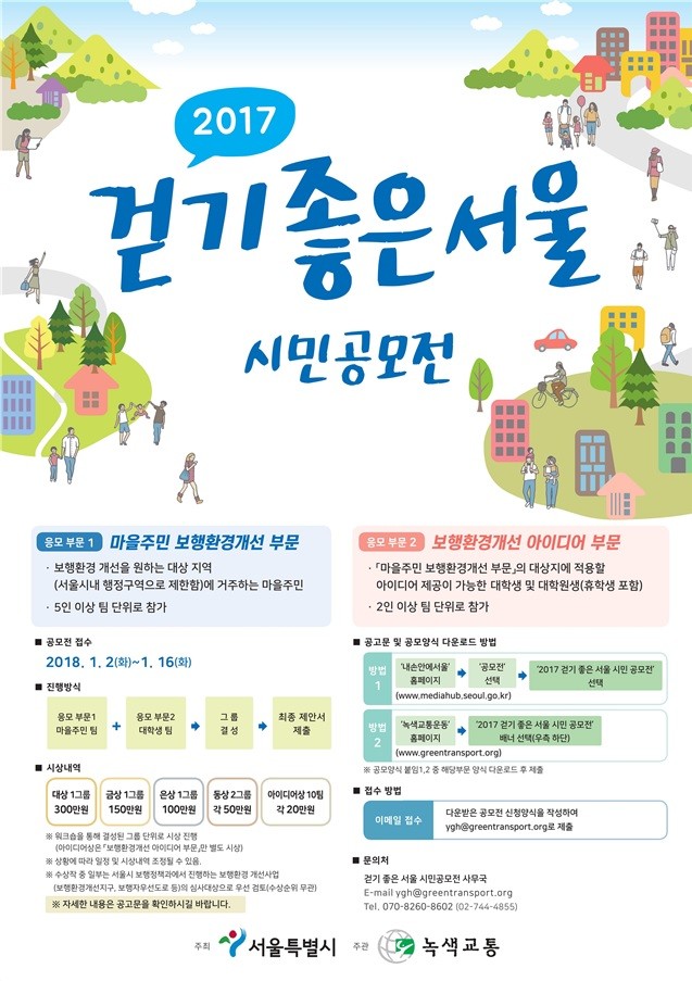 [환경데일리 한영익 기자]위험하고 불편한 마을길 보행 환경을 시민이 주도해 안전하고 편리한 보행자 중심의 마을길로 만들기 위한 '2017 걷기 좋은 서울 시민 공모전'이 서울시 주최, (사)녹색교통운동 주관으로 개최된다.