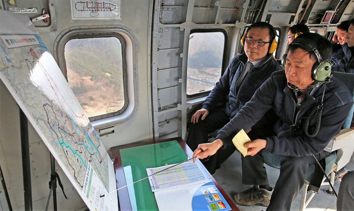 | ▲이상욱 경주 부시장(사진 왼쪽)이 관련 공무원들과 함께 헬기를 통해 경주시 소나무재선충 방제에 대해 항공시찰을 하고 있다. |