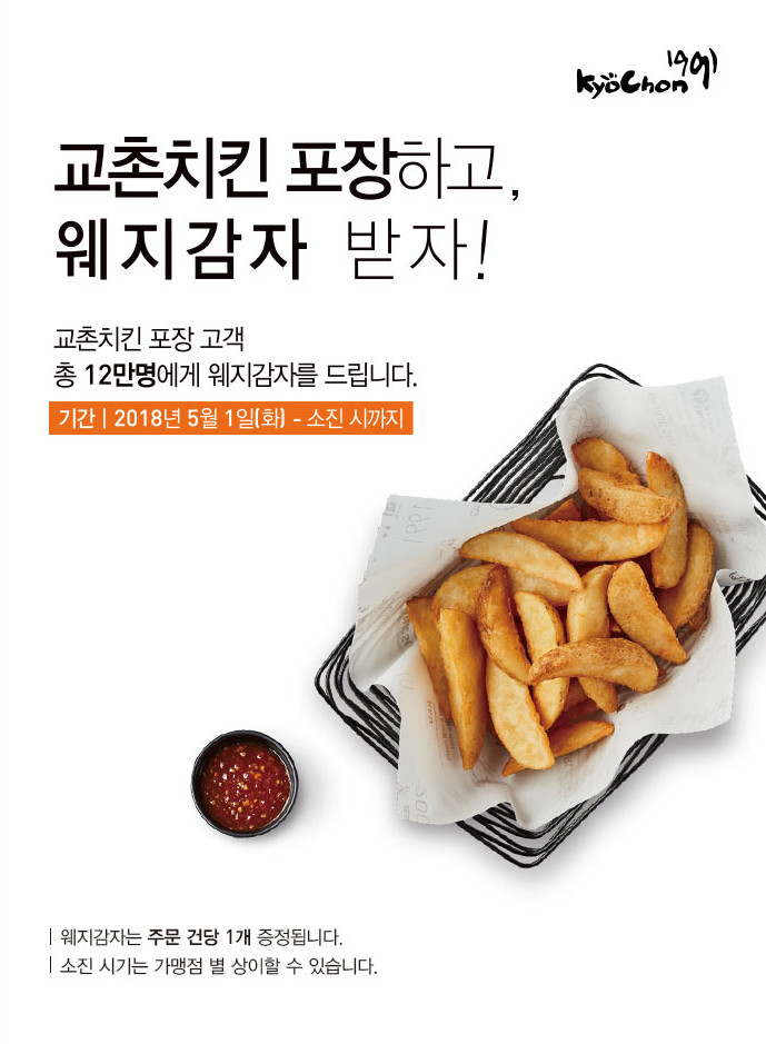 교촌치킨은 가족 행사가 많아지는 5월, 온 가족이 풍성하게 치킨을 즐길 수 있도록 방문 포장 고객을 대상으로 웨지감자를 증정한다. 웨지감자 증정 이벤트는 총 12만명에게 제공될 예정이며, 각 가맹점 별 선착순으로 증정된다.