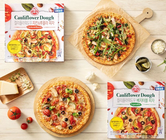 ㈜오뚜기는 도우에 컬리플라워를 넣어 건강함을 더하고, 도우 반죽에 컬리플라워 채수를 사용한 '컬리플라워도우 피자' 2종을 출시했다.