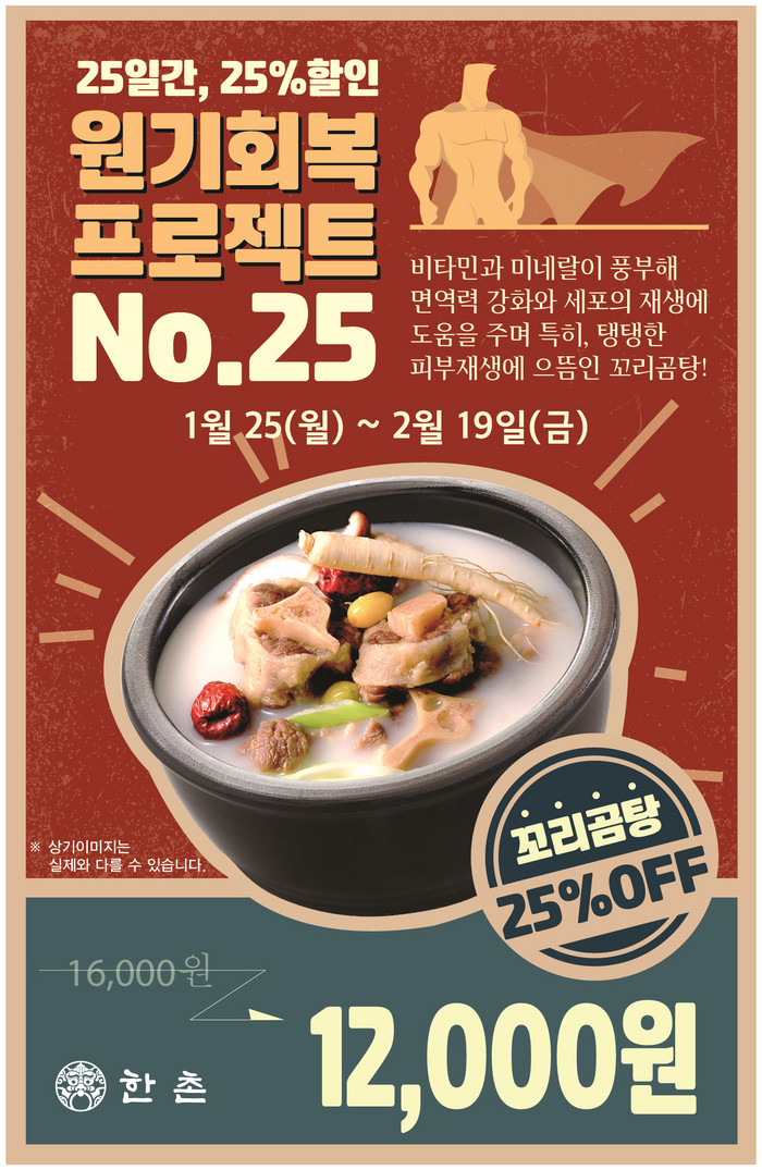 꼬리곰탕의 할인행사 기간은 오는 1월 25일부터 2월 19일까지 진행하며 기존 가격에서 4000원 할인된 1만2000원의 가격으로 25일간 판매한다.