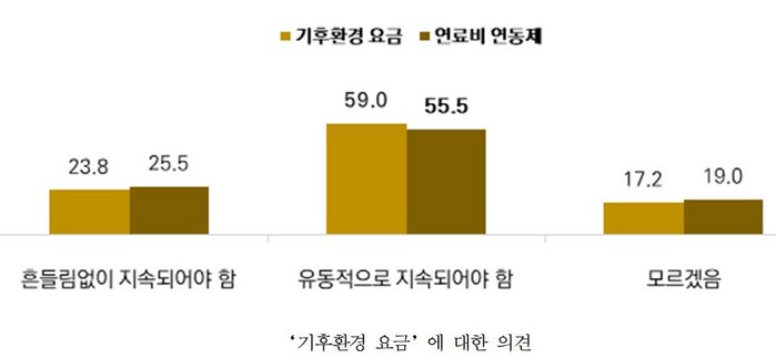 국민의 45%는 '기후환경 요금'과 '연료비 연동제'에 찬성하고 있었으며 두 제도 모두 지속돼야 한다는 의견은 55%이상을 차지했다.