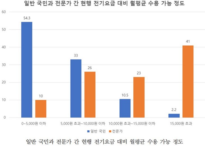 이에 현재 월 평균 전기요금에서 부담 가능한 추가 금액은 '5000원 이하’(54.3%) 라고 밝혔다. 하지만 전문가의 경우 '1만5000원 초과'(41%) 수준도 수용 의지가 있다고 밝혔다.