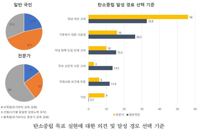 국민(32.8%)과 전문가(56%) 모두 2050 탄소중립 달성에 '국내 여건을 고려해야 한다'고 답했다.