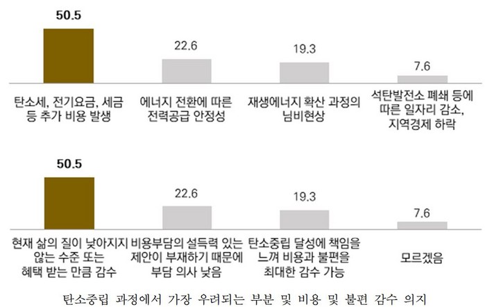 탄소중립 이행 과정에서 가장 우려되는 부분을 묻는 질문에 일반 국민의 50.5%가 '탄소세, 전기요금, 세금 등의 추가 비용 발생'이라 답했다.