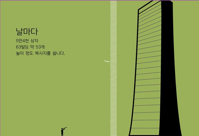 [환경데일리 최인배 기자] 우리나라 한해 복사지 사용량은 2억9000만kg, 나무 700만 그루, 이는 날마다 쓰는 복사지만 63빌딩 53개 높이다.