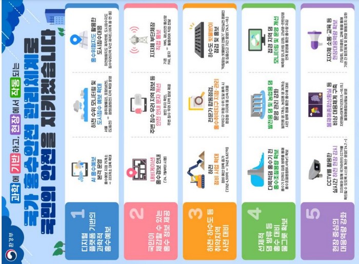 이번 대책은 '과학에 기반, 현장에서 작동되는 홍수 안전체계 마련'을 목표로 ▲인공지능 홍수예보 ▲국민체감형 정보 제공 ▲취약지역 사전 대비 ▲홍수 대비 물그릇 확보 ▲현장 대응역량 강화 등 5가지 중점과제로 추진한다.