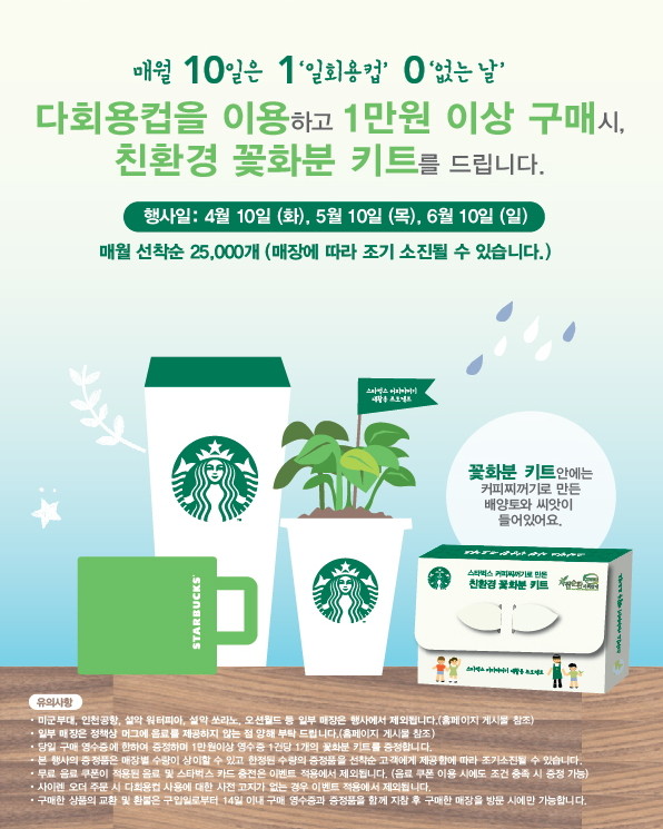 '일회용컵 없는 날'에 제조음료 포함 1만원 이상을 개인 다회용컵 또는 매장 머그로 주문 시 친환경 꽃화분 키트를 2만5000명에게 선착순으로 전달하며 총3회 동안 7만5000명의 고객에게 제공할 예정이다.