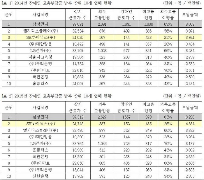 이 자료에 따르면 2014년부터 2016년까지 삼성전자는 연평균 80억원 이상의 고용부담금을 납부했다. 반면, 상위 10대 기업 중 장애인 의무고용 비율이 가장 낮은 기업은 SK하이닉스(주)로 평균 26%에 불과했다.