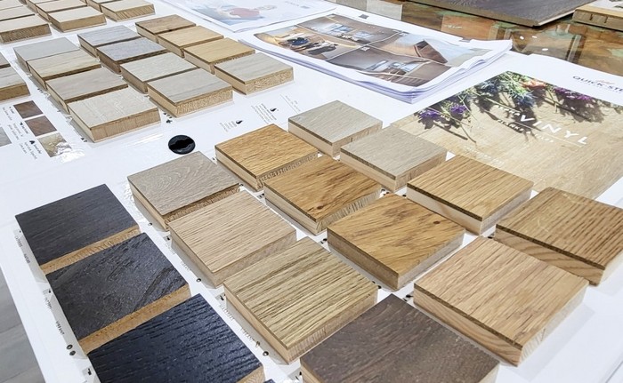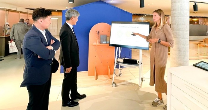 | ▲권혁태 대표이사는 벨기에 유니린사를 방문해 본사 관계자로 부터 친환경 바닥재 퀵스텝(Quick-Step) 등 제품군들을 설명듣고 있다. 독점 수입해 국내에 유통하고 있다. |