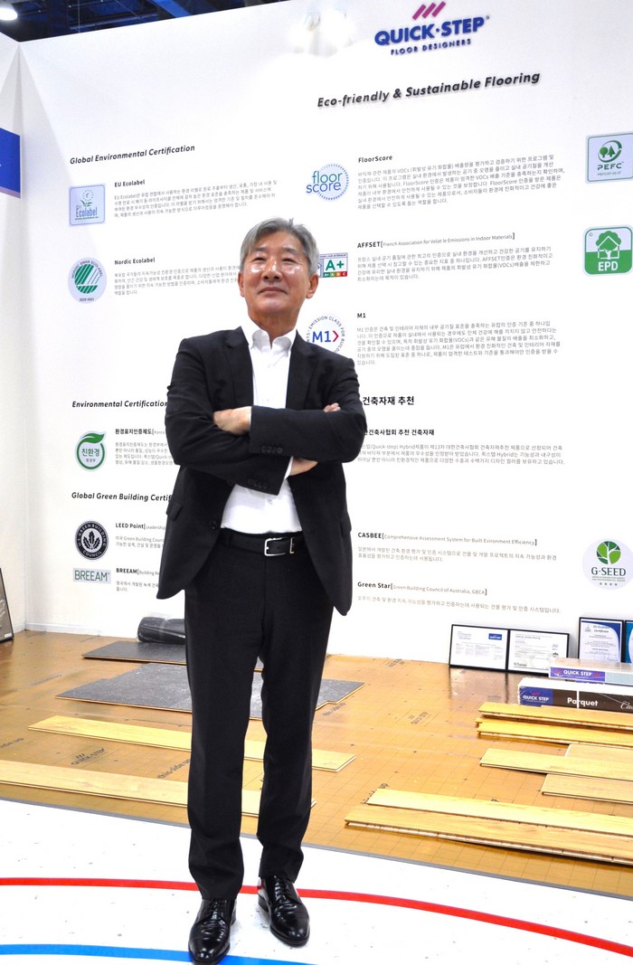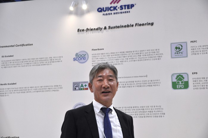 그는 "마루재에도 등급이 있는데 최고의 품질 기준은 까다로운 '유럽 에코라벨' 인증이 기본"이라며 "친환경 인증은 사람의 인체와 함께 호흡하는 친환경 마루재가 아니면 명함도 못 내미는 수준의 제품을 제조사들에게 요구하고 있다."고 했다.