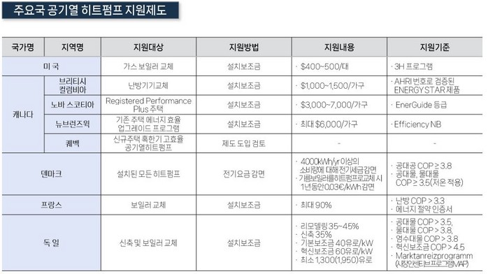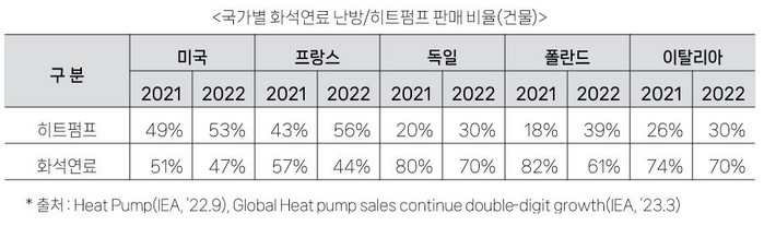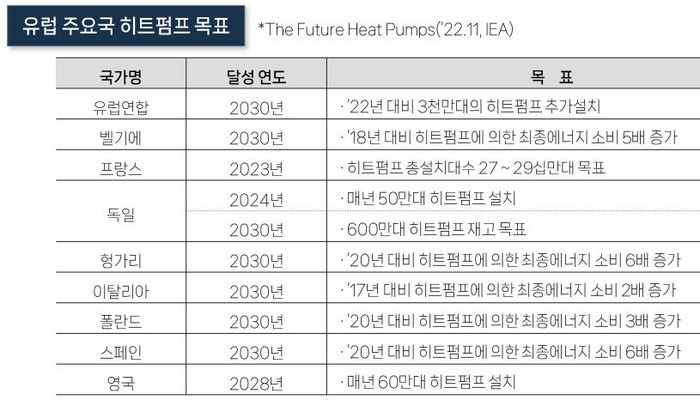 그 대안이 바로 국제에너지기구 IEA 등에서 히트펌프를 건물 난방의 효율성을 개선하고 탈탄소화에 있어 핵심 설비로 인식했기 때문이다. 특히 세계 주요 국가들 역시 탄소중립 달성을 위해 건물, 산업부문 온실가스 감축을 위한 방안으로 에너지 효율 향상을 위한 히트펌프 보급 추세로 꿈틀거리고 있다.