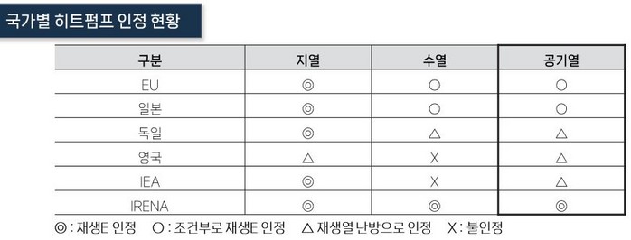 안타깝게도 우리나라는 지열, 수열, 폐열 등 제한적으로만 재생열을 받아들이고 있다. 열에너지 이용분야에서 온실가스 배출의 40%다. 발전, 수송, 건물, 산업 등 다양한 분야에서 발생하는 온실가스를 감축하려면 지열, 수열, 공기열, 태양열을 가릴 것이 아니라 모든 재생열을 적극적으로 도입하고 상호 보완한다는 인식을 새로이 할 필요를 삼성전자, LG전자, SK, 현대차그룹, 한화, 포스코 등 대기업에서조차 공감하고 있다.