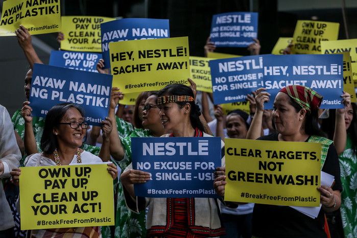 ▲환경 운동가들이 마카티시에 위치한 네슬레의 필리핀 본사앞에서 필리핀의 플라스틱 오염을 조장한 네슬레의 책임을 강조하는 배너를 들고 항의하고 있다. 네슬레는 2018년 전 세계에서 진행된 플라스틱 쓰레기 수거활동 및 브랜드오딧 결과 최악의 플라스틱 오염 유발 기업 중 하나로 알려지고 있다. |