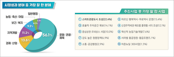 지난 1년간 추진한 정책 중 '가장 잘한 사업'을 묻는 질문에 ▲스마트관광도시 조성(22.4%) ▲어르신 행복택시‧무료택시 운영(15.4%) ▲효율적 주차공간 확보(14.1%)를 선택했다.