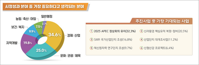 가장 기대되는 사업을 묻는 질문에 ▲2025 APEC 정상회의(경주)유치(32.3%) ▲신라왕경 핵심유적 복원‧정비(20.5%) ▲SMR 국가산업단지 조성(16.8%) ▲노후 산업단지 대개조사업(11.2%) ▲혁신원자력 연구단지 조성(9.7%) ▲신형산강 프로젝트(6.4%) 순으로 답했다.