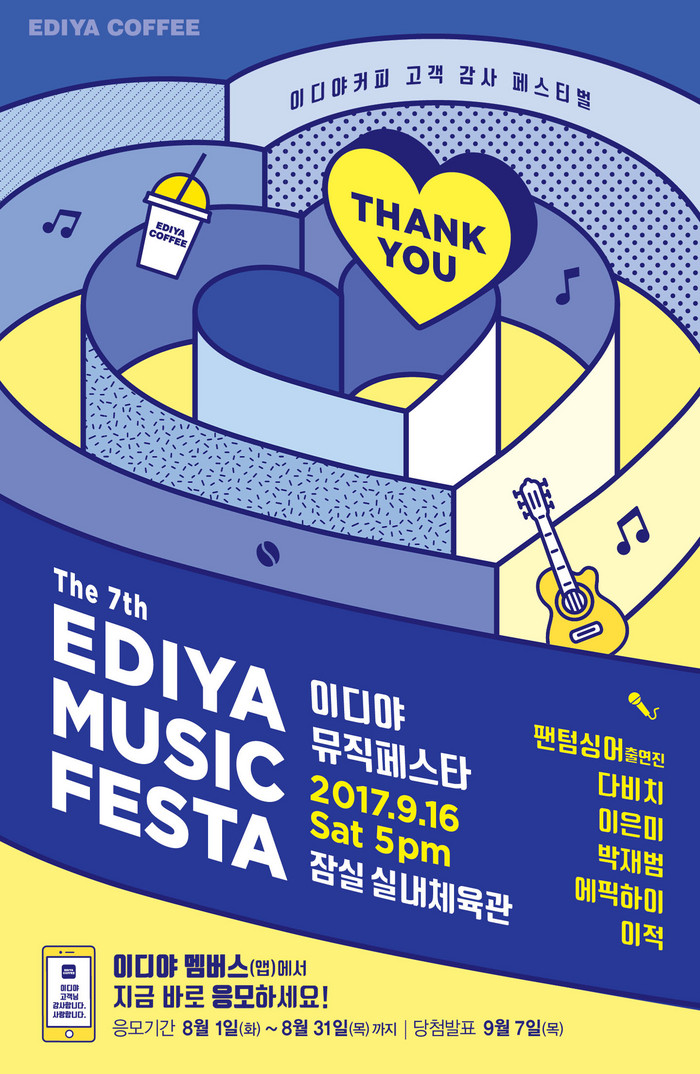 국내 대표 커피브랜드 이디야커피(대표이사 회장 문창기)가 다음달 16일 잠실 실내체육관에서 '제 7회 이디야 뮤직페스타(7th EDIYA MUSIC FESTA)'를 개최한다.