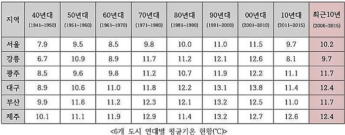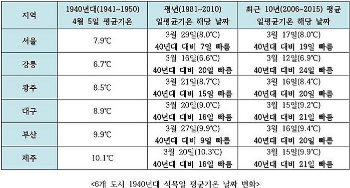 6개 도시의 2월부터 4월까지의 일평균기온을 최근 10년간 평균 내 분석한 결과, 일평균기온 6.5℃를 기록하는 시점이 평년보다 더 빨라지고 있다.