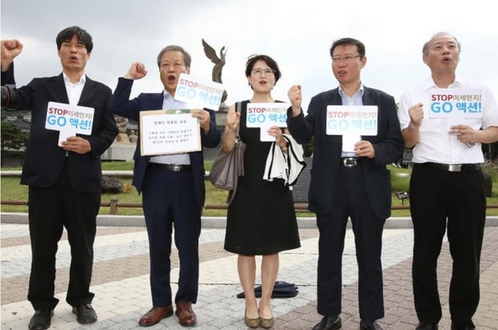 ▲지난해 7월 26일 국회와 청와대 앞에서 미세먼지 직속 특별기구를 설치하는 환경재단 등 시민단체의 주장이 있었다. 그만큼 국내 미세먼지는 선을 넘어선 상태로, 정부가 특단의 조치를 하지 않으면 안될 최악의 매우나쁨으로 치닫고 있다. |
