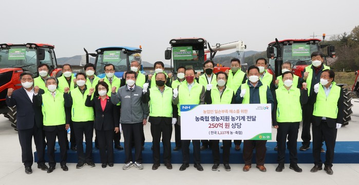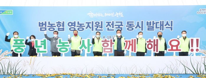 [환경데일리 문종민 기자]18일 충남 보령 주산농협 관내 육묘장에서 개최한 '범농협 영농지원 전국동시 발대식'에서 이성희(왼쪽 다섯번째) 농협중앙회장과 홍문표(왼쪽 네번재) 국회의원, 어기구(왼쪽 여섯번째) 국회의원 등이 풍년농사를 기원하는 퍼포먼스를 하고 있다.