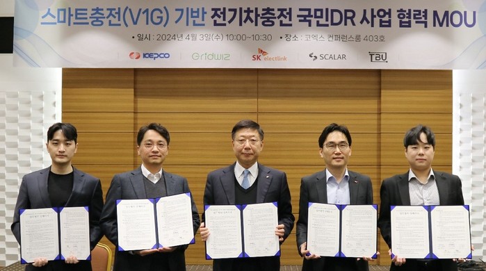 KEPCO 한국전력(대표이사 사장 김동철)은 3일 전기차 충전기를 전력수요자원으로 활용하기 위해 수요관리사업자인 ㈜그리즈위즈(대표김구환), 충전사업자인 SK일렉링크㈜(대표 조형기), ㈜스칼라데이터(대표 윤예찬), ㈜티비유(대표 백상진)와 스마트충전(V1G) 기반 전기차충전 국민DR 사업'추진 업무협약을 체결했다.
