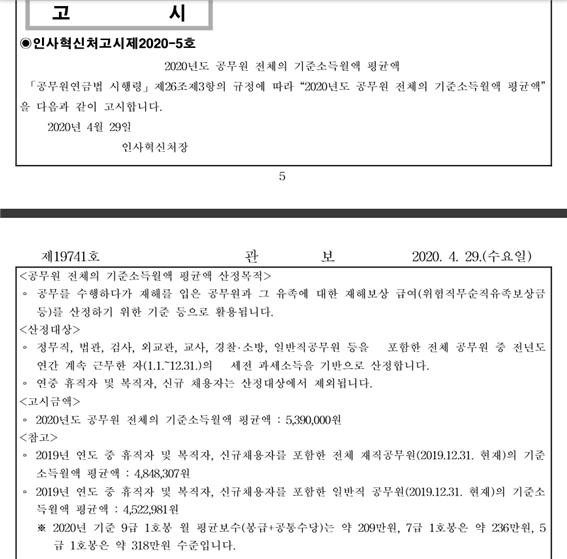 인사혁신처는 29일 관보를 통해 '2020년도 공무원 전체의 기준소득월액 평균액'을 539만원(작년 530만원)이라고 고시했다. 연봉으로 계산하면 세전소득이 6468만원인 셈이다.