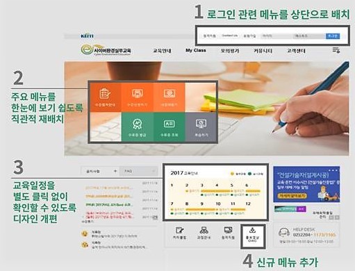 특히 온라인교육 사이트의 특성을 살려 이용자가 한 번의 클릭으로 필요한 수강절차 메뉴에 들어갈 수 있도록 배치했고, 홍보 동영상 및 열린 환경지식 등의 신규 메뉴도 추가했다.