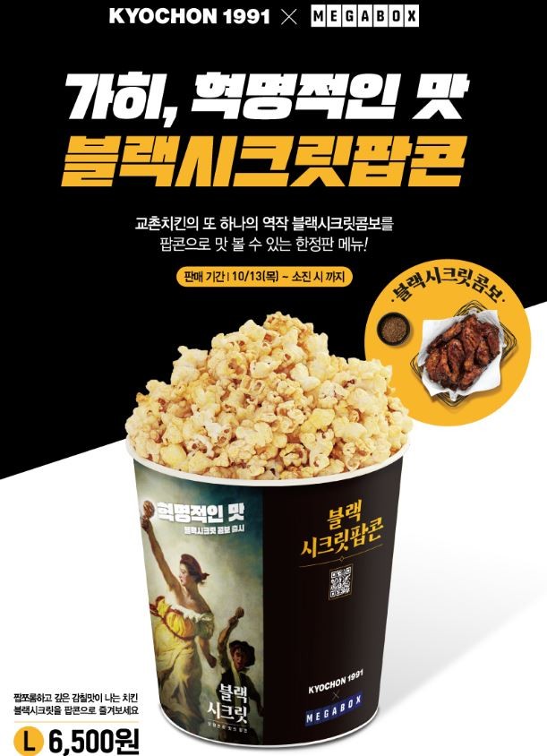 국내 대표 치킨 프랜차이즈 교촌치킨을 운영하는 교촌에프앤비㈜가 멀티플렉스극장 메가박스와 함께 '블랙시크릿팝콘'을 선보인다.