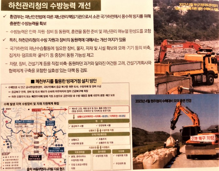 박 전무는 "훙수 피해 이수 예산을 잠시 확보할 수 있으나 평상시에는 예산과 관심의 부적으로 관리부실과 시설 노후화가 발생하는 경우가 많다."며 "하천 우지관리와 위기대응을 위한 제도와 기술을 정비하고, 특히 하천의 특수성을 고려해 점검. 진단 등의 효율성을 개선하고 위기 대응에 대한 매뉴얼과 대응방법을 구체화할 필요가 있다."고 제안했다.