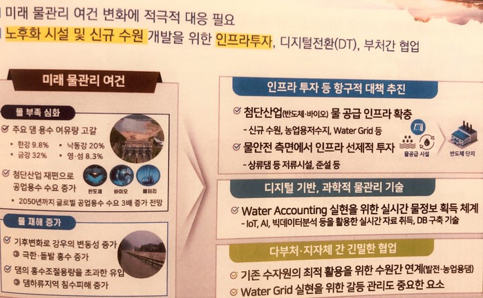 권 교수는 "수자원 관리 발전 방향은 미래 물 관리 여건 변화를 고려한 적극적인 대응이 필요하다."며 노후화 시설 및 신규 수원 개발을 위한 인프라 투자와 디지털 전환, 부처 간 협업 등을 거듭 제시했다.