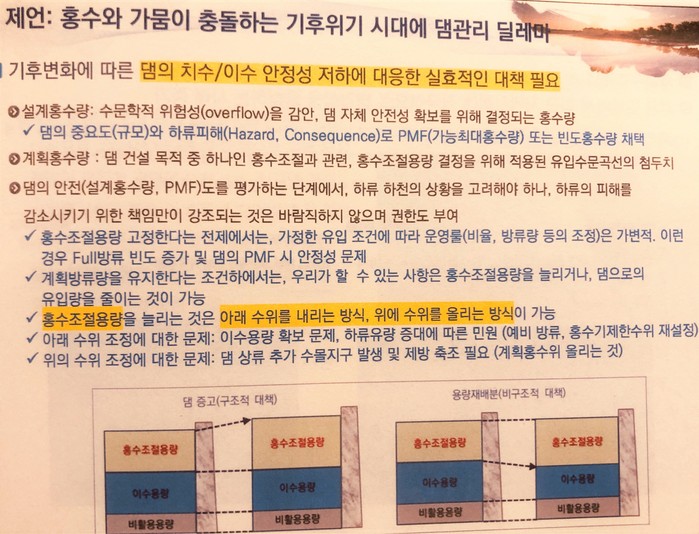 기후변화에서 기후위기로 깊숙하게 진입된 상황에서 사후복구 위주의 대책에서 벗어나 하천과 댐 시설 등의 설계기준 강화와 지류와 하천을 포함한 하천정비가 우선돼야 할 것으로 제시됐다.