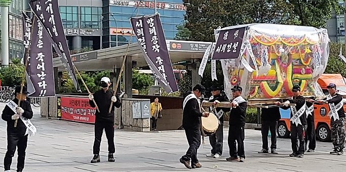 [환경데일리 김영민 기자]서울 서초구 양재역 1번 출구 서희건설 본사 앞에는 40여명의 조합원들이 매일 상여맨 이들이 곡소리를 내고 있다.