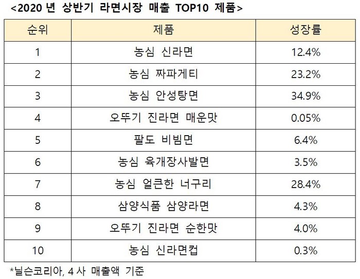 닐슨코리아에 따르면, 상반기 국내 라면시장은 전년 대비 7.2% 성장한 약 1조 1300억원 규모로, 반기 실적으로는 사상 최대치를 기록했다. 위기를 겪으면서 시장은 안정을 택했다. 소비자들은 맛과 품질이 검증된 시장 대표 브랜드를 선택했고, 유통채널에서도 인기제품 위주의 주문이 이어졌다.