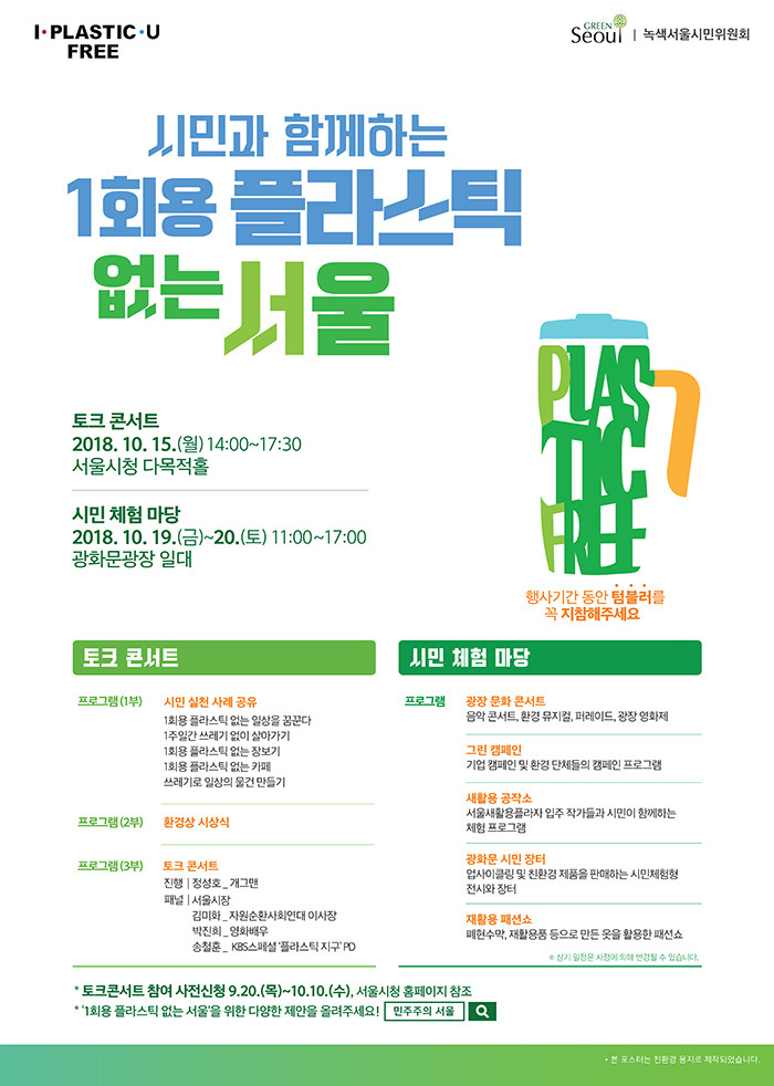 다양한 시민 실천 사례를 나누고, 서울시장과 함께하는 토크콘서트를 통해 1회용 플라스틱 없는 서울을 만드는데 동참해 보아요.