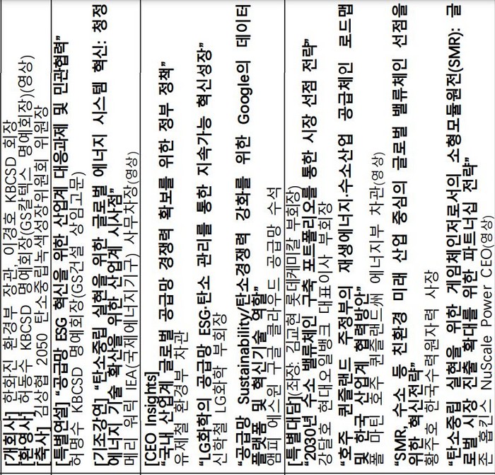 [환경데일리 김영민 기자]청정에너지 기술 어디까지 적용가능하는지(IEA), 2차소재, 배터리 분야의 화학업계는 ESG와 탄소관리 핵심 기술과 내부시스템(LG화학), 수소산업망을 위한 밸류체인 구상(현대오일뱅크), SMR 에너지원 체인저로 타당성(한수원)까지 해당 기업과 국제기구에서 밝혔다.