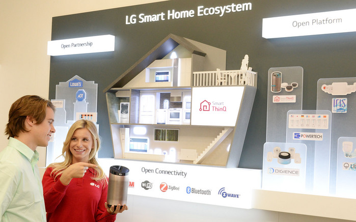 LG전자는 스마트씽큐 허브(SmartThinQTM Hub)를 처음 선보이며 스마트홈 시장 주도권 잡기에 나섰다. 기다란 모양의 스마트씽큐 허브는 ▲스마트홈 서비스 지원하는 홈 게이트웨이 ▲가전제품 상태뿐만 아니라 개인 일정, 날씨 등의 정보 3.5인치 화면과 음성으로 제공 알림 센터 ▲음악을 들려주는 프리미엄 스피커 등 여러 가지 기능을 수행한다.