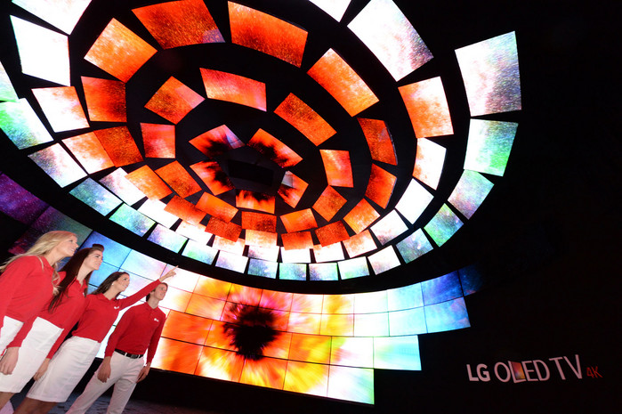 LG전자는 슬림하면서 고급스러운 느낌의 올레드 TV를 선보였다. 올레드는 백라이트 없이 스스로 빛을 내기 때문에 색을 정확하게 표현할 수 있어 자연색에 가장 가까운 화질과 완벽한 블랙을 구현한다. 또 올레드는 빛샘 현상이 없어 관람객들이 어느 각도에서 보더라도 색의 왜곡이 없다.