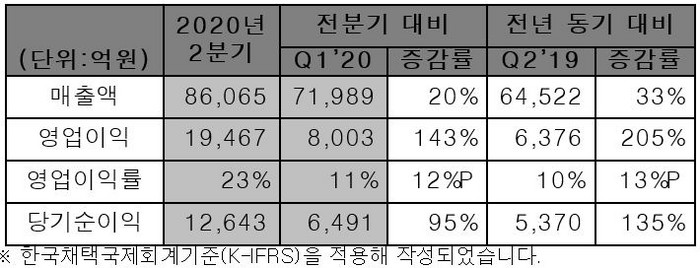 2분기 매출액 8조6065억,영업익 1조9467억 원