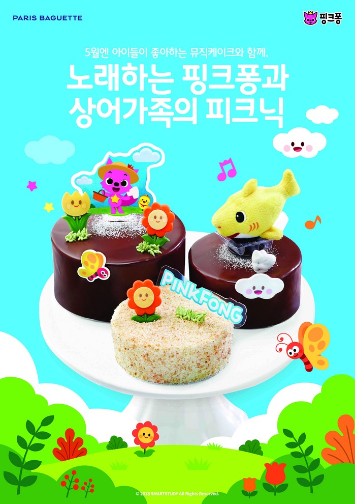 파리바게뜨는 ▲케이크 상단의 상어인형 장식을 누르면 '상어가족 노래'가 흘러나오는 '노래하는 핑크퐁과 상어가족의 피크닉' △케이크 위의 콩순이 장식에서 흥겨운 '공룡송(song)'이 흘러나오는 '콩순이 공룡송케이크'▲휴대전화 불빛을 비추면 뽀로로와 크롱 장식이 춤을 추는 '이집트에 간 트래블러 뽀로로' 등 어린이들이 좋아하는 인기 캐릭터와 협업한 제품을 선보인다.