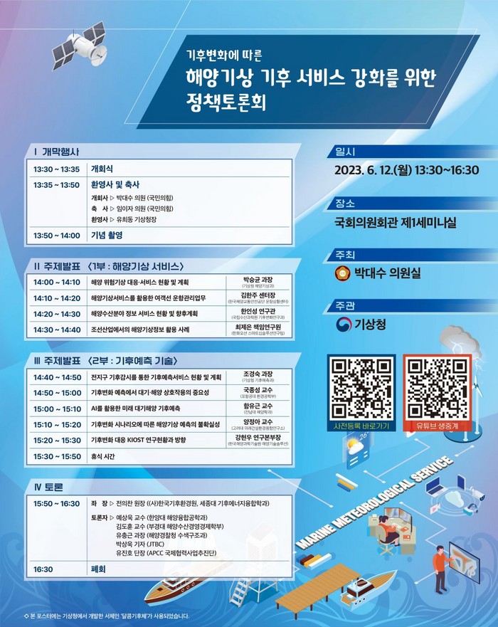 이번 행사는 기상청 유튜브 채널을 통해 생방송으로 함께 진행되며, 1부와 2부는 해양기상 ·기후 관련 전문가 발표, 3부에서 토론이 진행될 예정이다.