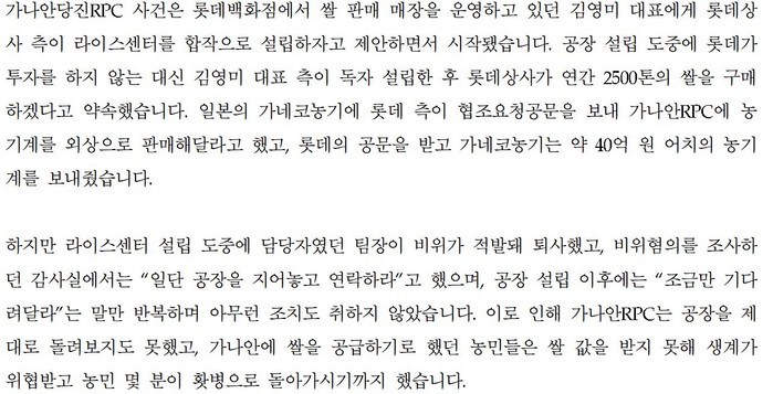 또 "롯데상사의 박 팀장이 가나안네츄럴 김영미 대표와 공동으로 라이스센타를 건립키로 했다며 라이스센타에 필요한 기계를 외상으로 보내달라는 공문을 보내왔다."고 밝혔다. 일본 내에서 롯데의 평판이 나쁘지 않고 신용을 중시하는 일본의 기업 풍토를 생각했을 때 롯데의 공문을 믿고 거액의 기계들을 일본 내의 4개 업체에서 수급해 한국으로 보냈다는 것이다.