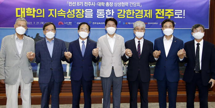 | ▲전주시는 최근 시청에서 우범기 전주시장, 김동원 전북대 총장, 박병춘 전주교육대 총장, 박진배 전주대 총장, 김찬기 예수대학교 총장, 정상모 전주비전대 총장, 조희천 전주기전대학 총장 등이 참석한 가운데 민선 8기 전주시 대학 상생협력을 위한 총장 간담회를 가지고 협력을 논의했다. |