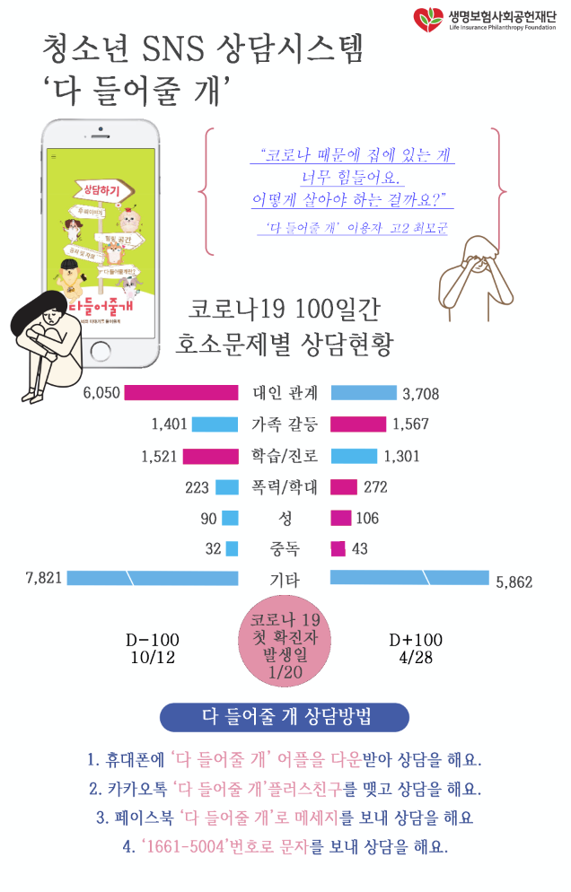 코로나19 확진자가 발생 100일이 지났다. 생명보험재단(이사장 이종서)은 사회적 거리두기가 장기화됨에 따라 24시간 SNS 기반 상담 시스템인 '다 들어줄 개' 모바일 상담 시스템을 찾는 청소년 고민의 양상이 달라졌다고 밝혔다.
