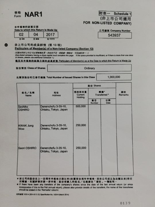 ▲말리바 법인등록서류. 곽정소 회장의 배우자 오시로 사치코의 지분이 50%로 사실상 가족 기업인 셈이다. 곽 회장의 아들 정우씨와 친인척으로 추정되는 오시로 사오리씨 의 지분이 각각 25%로 명시돼 있다. |
